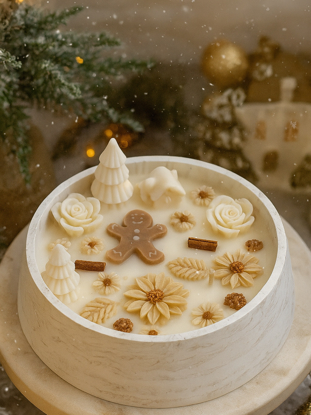 Chaque bougie est unique : coulée à la main, décorée de fleurs délicates et de détails dorés scintillants, elle évoque la magie et la douceur des fêtes de fin d’année. Parfaite comme cadeau de Noël ou comme pièce décorative, elle transformera votre table ou votre salon en un cocon lumineux et parfumé.
